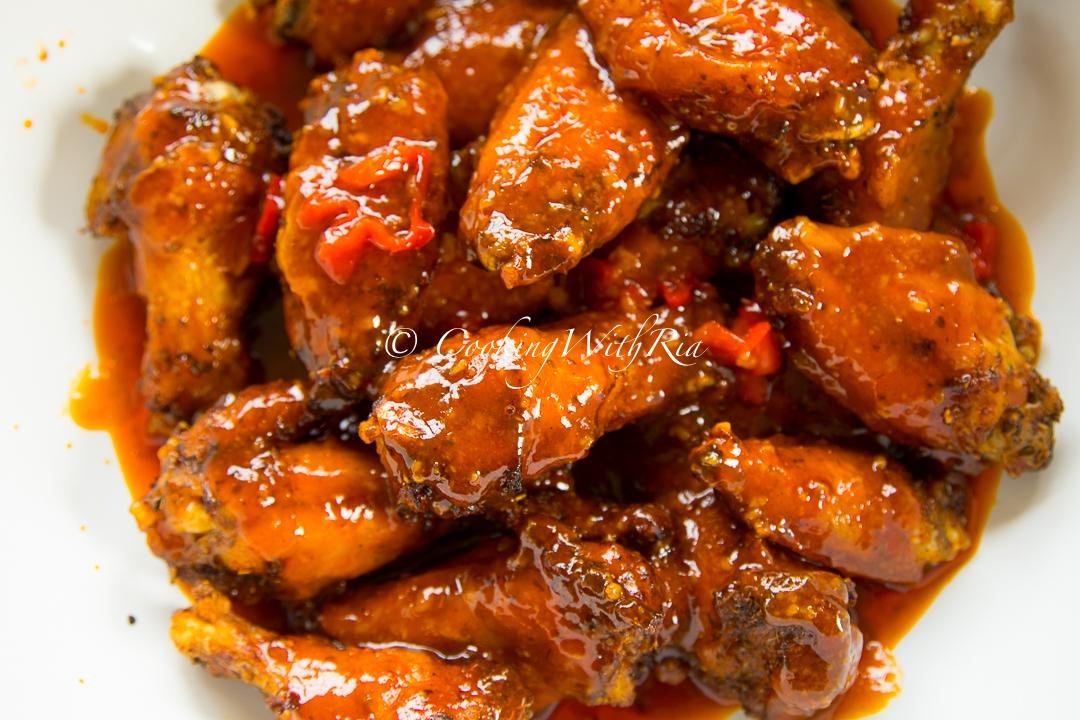 - Meanwhile, in a small saucepan, bring all the ingredients to a boil, then simmer over low heat for 5 minutes or until the sauce has reduced by half. Pour into a large bowl. Add the cooked wings and toss to coat.